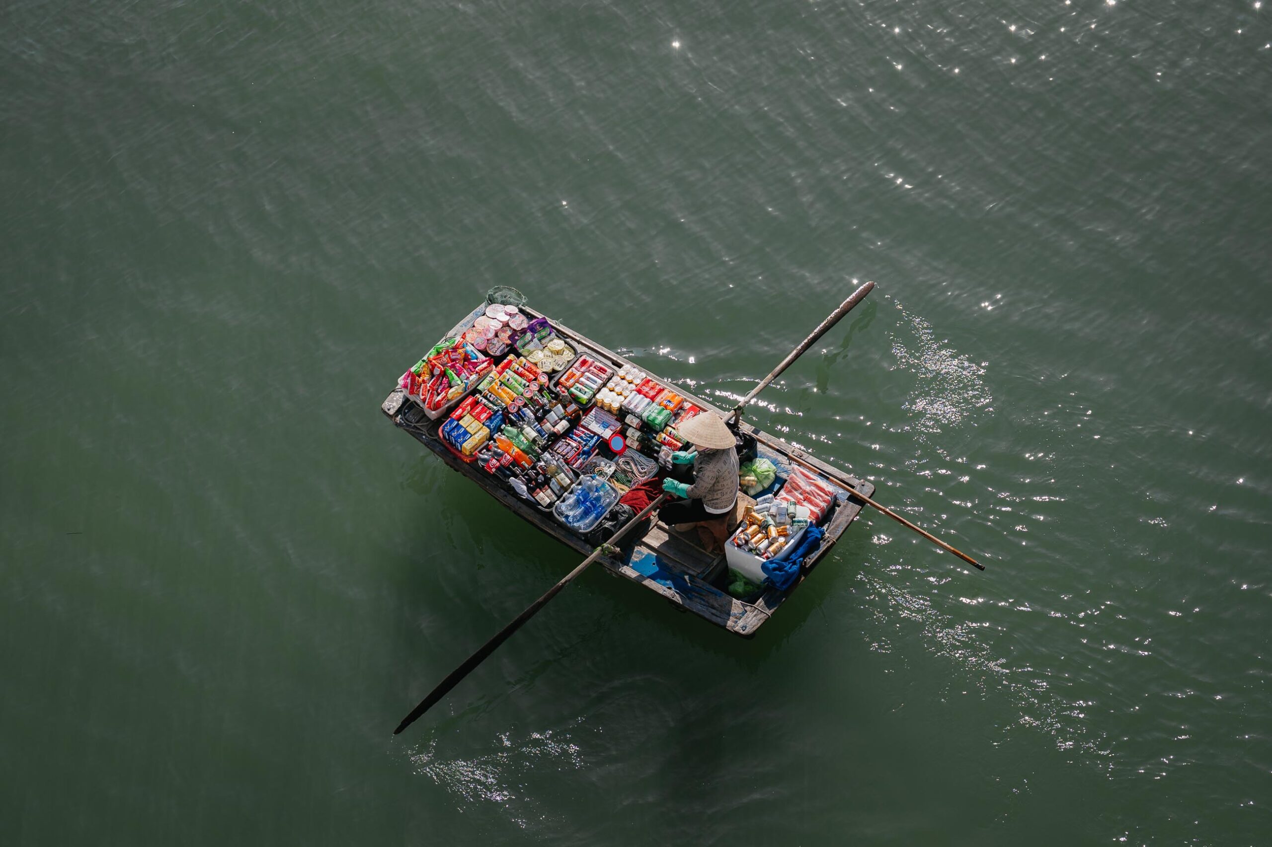 Ogni tanto, qualche piccola imbarcazione a remi scivola accanto alla nostra giunca: sono dei venditori “galleggianti”, che provano a attirare l’attenzione dei turisti mostrando frutti e prodotti locali.
